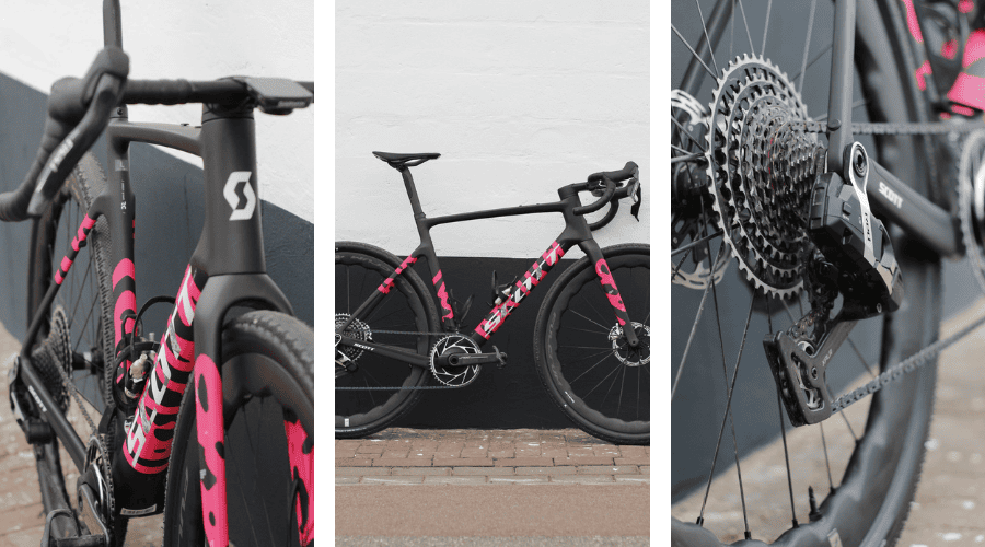 La géométrie ressemble à celle d’un vélo de route. Cependant, l’angle de direction est plus slacker (moins raide) et l’empattement légèrement plus long, ce qui améliore le contrôle et la stabilité. La position de conduite se veut plus confortable et le cadre plus robuste. - Les pneus